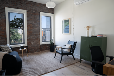 Guests and members can enjoy a welcoming waiting area and lounge, complete with a large, comfy couch, a curated bookshelf, and coloring supplies for mindful doodling while you wait. For those looking to unwind or focus, our quiet co-working zone offers a peaceful spot to study, work, or enjoy a meal in a calm, respectful environment. We also provide a kitchenette and two clean, well-maintained bathrooms for your convenience.